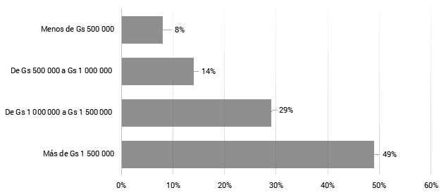 En la Figura 3, el 49% tiene un ingreso de más 1.500.000 Gs, por otro lado, el 29% gana entre 1 000 000 y 1 500 000 Gs, mientras que un 14% alcanza ingresos de 500 000 a 1 000 000 Gs. Y finalmente, solo un 8% genera menos de 500. 000 Gs al mes.