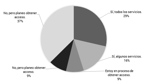 La Figura 5, muestra que el 37% de los encuestados no tiene acceso a todos los servicios básicos (agua, energía, salud) pero planea obtener acceso, mientras que el 29% tiene acceso a todos los servicios, un 16% a algunos servicios, el 9% se encuentran en proceso de obtener, y finalmente el 9% planea tener acceso a esos servicios.