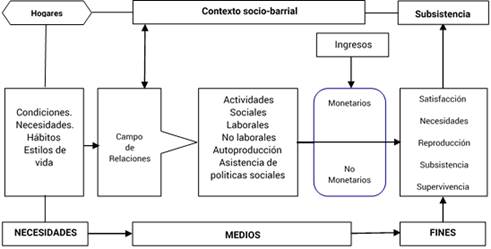 Los procesos de vulnerabilidad signados por los cambios en los procesos macro sociales repercuten directamente en las condiciones de vida de los sectores carenciados, ampliando o intensificando sus niveles de pobrezas; así, la sostenida caída (escasez) de ingresos, el deterioro de las condiciones de empleo, la reducción de las políticas sociales del Estado (entre otros factores) inciden en el proceso de reproducción de estos colectivos sociales, impulsándolos de esta manera a introducir cambios y reajustes a nivel de sus estrategias domésticas. En tal sentido el ámbito doméstico aparece como el espacio en el que se procesan las decisiones (los cambios y reacomodos) necesarias para alcanzar la subsistencia y la reproducción.