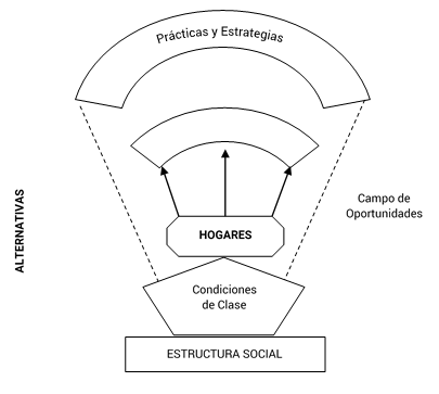 En el campo de las discusiones sobre reflexiones y estrategias, el análisis de cómo las familias participan en distintas actividades económicas, enfocado en sus estrategias, se vuelve más interesante cuando se considera que personas y los hogares no están completamente determinados por las estructuras, lo que sugiere que tienen cierta libertad para actuar frente a situaciones desfavorables, especialmente en aquellos sectores más desfavorecidos de la sociedad (García y Oliveira, 1994). De este modo, desde el punto de vista teórico metodológico, la idea de recuperar a las unidades domésticas y familias en sus dimensiones de actores sociales, se contrapone al análisis centrado en las estructuras sociales y su papel determinante en las prácticas de los diversos agregados de individuos y familias, dejando a estos un margen de posibilidades de acción (Figura 2).