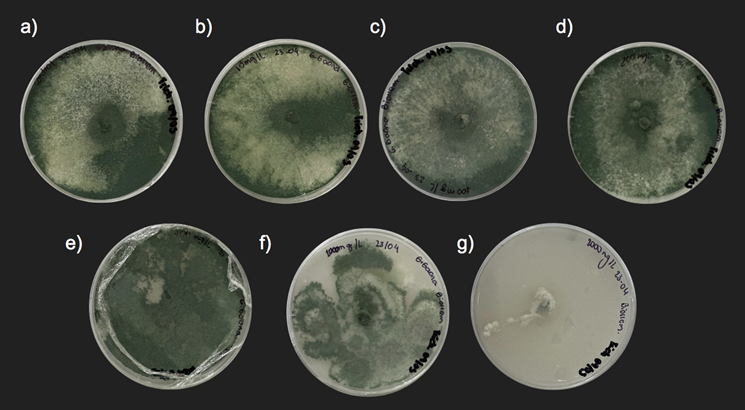Figura 4. Crecimiento micelial de T. asperelloides TF5 en PDA a diferentes concentraciones de cipermetrina en el Día 7. a) Control (0 mg/L) b) 10mg/L c) 100mg/L d) 200mg/L e) 500mg/L f) 1000mg/L g) 2000mg/L.