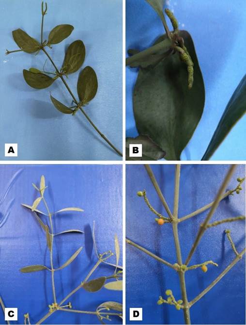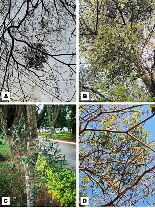 Figura. 1. Hábito de las especies de Phoradendron estudiadas. A y C. P. quadrangulare planta hemiparásita, creciendo sobre árbol de “lapacho rosado”, Handroanthus impetiginosus (Mart. ex DC.) Mattos. B. P. bathyoryctum planta hemiparásita creciendo sobre árbol de “guajayvi”, Cordia americana L. D. P. quadrangulare creciendo sobre “lapacho amarillo”, Handroanthus albus (Cham.) Mattos. Fotos: S. Núñez-Meza