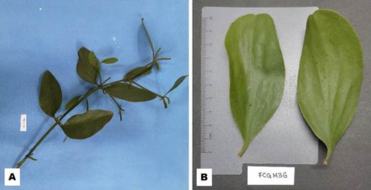 Se realizó la observación macroscópica de la hoja y sus partes (Figura 2, A-B), considerando el pecíolo y el limbo (base, ápice, borde). Las mediciones de largo y ancho (tomados en la parte media) de la lámina y del pecíolo, de 20 hojas, se efectuaron con regla milimétrica y fueron expresadas en cm. Se reportó el promedio y la desviación estándar de dichas mediciones.