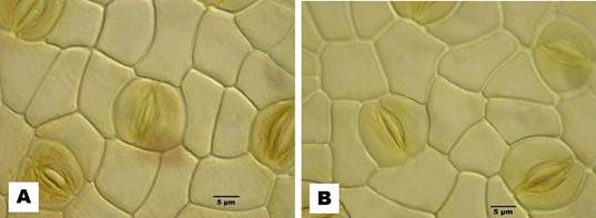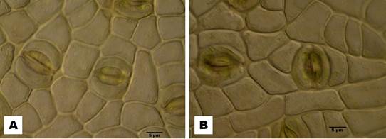 Figura 5. Phoradendron bathyoryctum, vista superficial de la lámina. A. Epidermis adaxial. B. Epidermis abaxial. En ambas epidermis se ven estomas hemiparacíticos, es decir con una célula paralela al eje longitudinal del estoma y las restantes epidérmicas normales. Escalas: A, B= 5 µm. Fotos: M. González