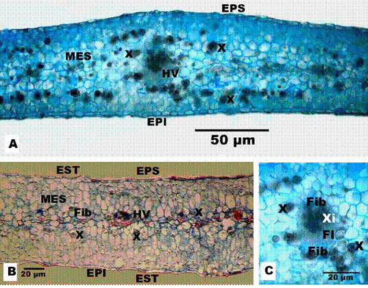 Figura 8. Phoradendron quadrangulare, sección transversal de lámina. A. Vista de la lámina cortada a mano alzada, se observa un haz vascular y la disposición de las drusas. B. Vista de la lámina cortada con micrótomo. C. Vista de la lámina, cortada a mano alzada, en la región del haz vascular. Fotos. M. González. Escalas: A= 50 µm, B, C= 10 µm. Ref.: EPI=epidermis inferior, EPS=epidermis superior, EST=estoma, Fib=fibras, Fl=floema, HV=haz vascular, MES=mesófilo, X=drusas, Xi=xilema